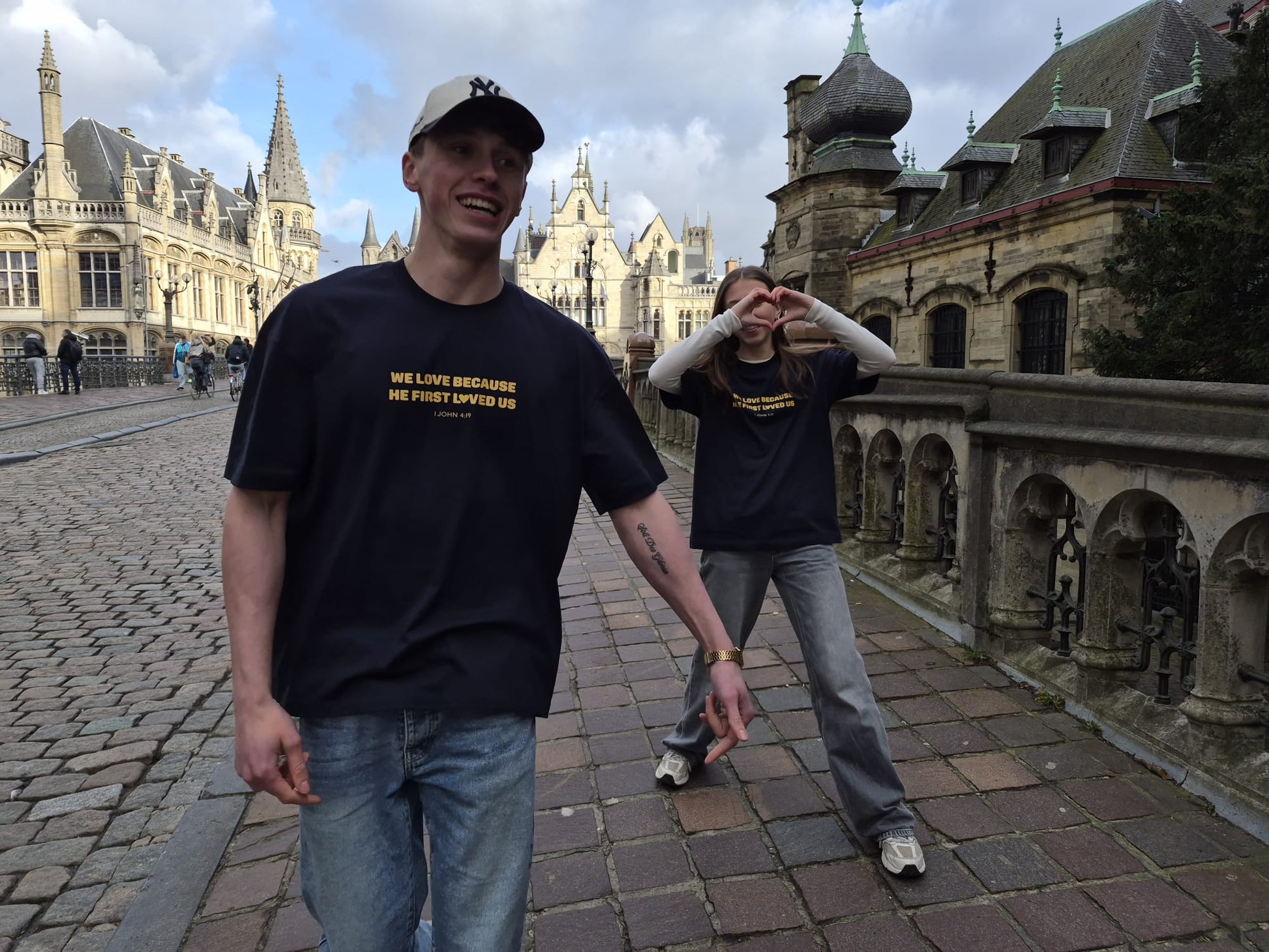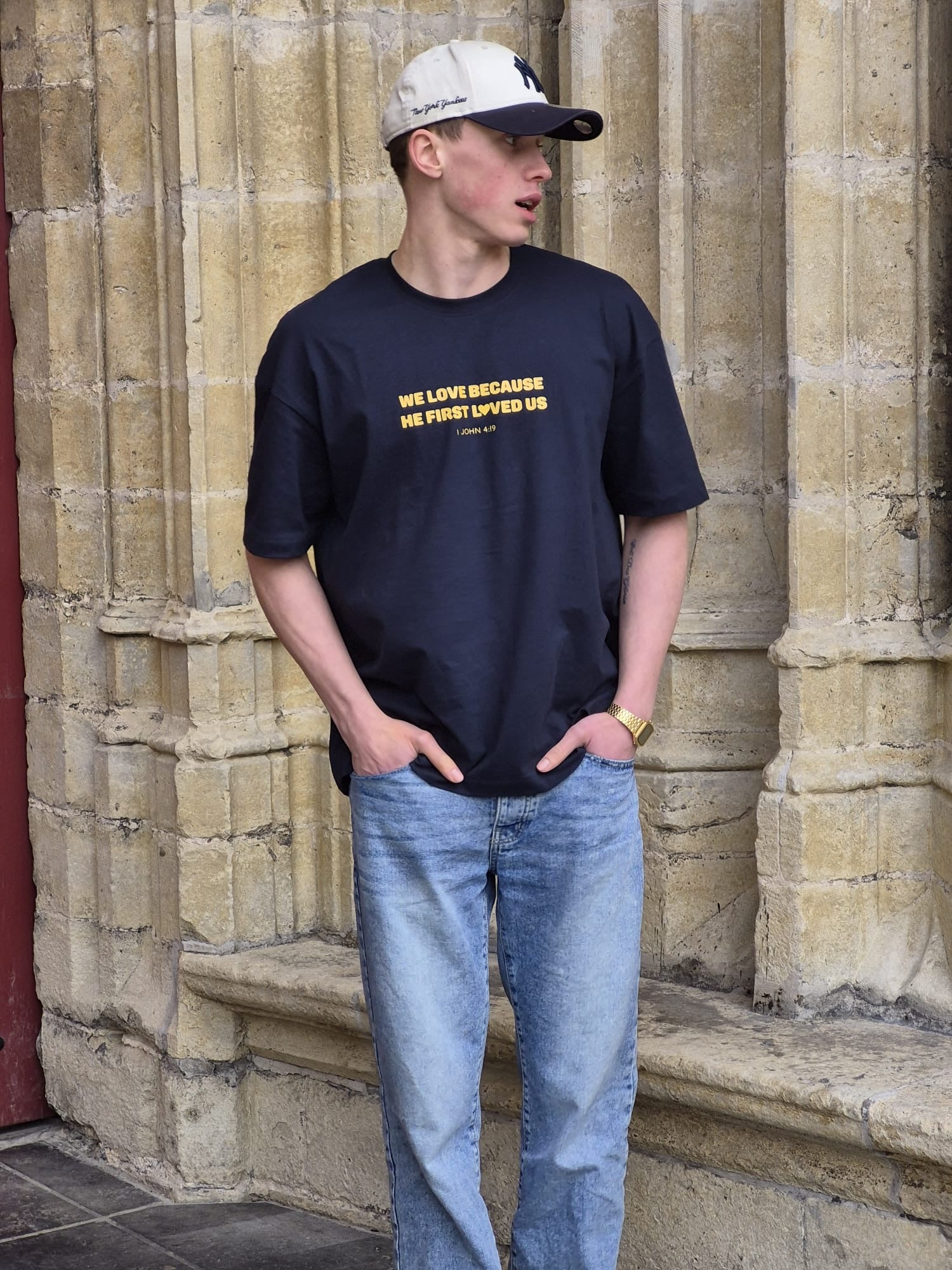 Het oversized fit navy shirt heeft een clean maar opvallende gele print met de tekst “1 John 4:19”: